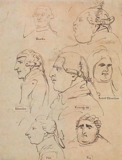 | Keywords: Thomas Rowlandson - Studies of George III and Statesmen - Google Art Project.jpg date London 1756 London 1827 Thomas male 2332358 Rowlandson British 1756 - 1827 /collection/yale-center-for-british-art/artwork/studies-of-george-iii-and-statesmen-thomas-rowlandson/2425984/ Thomas Rowlandson Artist /artist/thomas-rowlandson/4131603/ 4131603 /collection/yale-center-for-british-art/ Yale Center for British Art 2305845 http //britishart yale edu/ 2/23/2012 10 32 37 PM /collection/yale-center-for-british-art/artwork/studies-of-george-iii-and-statesmen-thomas-rowlandson/2425984/ 1772 undated George III 1738 “1820 king of the United Kingdom of Great Britain and Ireland and king of Hanover Fox Charles James 1749 “1806 politician Burke Edmund 1729/30 “1797 politician and author Pitt William known as Pitt the younger 1759 “1806 prime minister North Frederick second earl of Guilford known as Lord North 1732 “1792 prime minister Thurlow Edward first Baron Thurlow 1731 “1806 lord chancellor Kaunitz Wenzel Anton von Prince Fürst von Kaunitz-Rietberg 1711-1794 Austrian state chancellor statesmen men sketches portraits Pen and brown ink with graphite on medium moderately textured blued white laid paper mounted on medium smooth beige wove paper 205 2425984 False 1827 3/24/2012 8 01 12 PM YCBA/lido-TMS-5638 http //collections britishart yale edu/vufind/Record/1669945 Yale Center for British Art Paul Mellon Collection drawing 1770 1830 London Creation w157 x h205 cm undated False 0 763671875 Item studies-of-george-iii-and-statesmen-thomas-rowlandson Studies of George III and Statesmen s 157 <nowiki>Inscribed in pen and black ink on pieces of rectangular paper that has been mounted on drawing left to right upper center to lower center Burke Kaunitz George III Lord Thurlow Pitt Fox ; In graphite on drawing upper right Lord North; Verso in graphite lower right D26421 </nowiki> Inscription _Signed_and_Dated Not signed not dated Not on view Pen and brown ink with graphite on medium moderately textured blued white laid paper mounted on medium smooth beige wove paper George III 1738 “1820 king of the United Kingdom of Great Britain and Ireland and king of Hanover Fox Charles James 1749 “1806 politician Burke Edmund 1729/30 “1797 politician and author Pitt William known as Pitt the younger 1759 “1806 prime minister North Frederick second earl of Guilford known as Lord North 1732 “1792 prime minister Thurlow Edward first Baron Thurlow 1731 “1806 lord chancellor Kaunitz Wenzel Anton von Prince Fürst von Kaunitz-Rietberg 1711-1794 Austrian state chancellor statesmen men sketches portraits special url_id JgE-zoRs3PlYog PD-old-100-1923 1827 Drawings and watercolours by Thomas Rowlandson Google Art Project works by Thomas Rowlandson George III of the United Kingdom Edmund Burke Wenzel Anton Prince of Kaunitz-Rietberg Edward Thurlow 1st Baron Thurlow William Pitt the Younger Charles James Fox Frederick North Lord North Queues hair fashion Hair fashion in art |