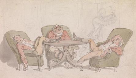 Keywords: Thomas Rowlandson - Three Sportsmen Sleeping at the Table in Their Chairs - Google Art Project.jpg No inscription Inscription _Signed_and_Dated Not signed not dated Not on View Watercolor with pen and gray-brown ink and graphite; verso graphite on medium slightly textured blued white wove paper sleeping red green color men sportsmen chairs arm table riding coats sporting art room special url_id yQEw17tYqxLRCw PD-old-100-1923 1827 Drawings and watercolours by Thomas Rowlandson Google Art Project works by Thomas Rowlandson |