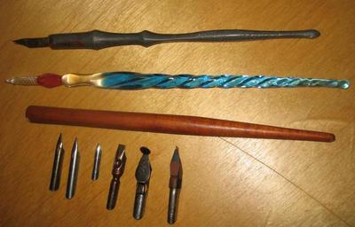 | Keywords: Three-pens-six-nibs.jpg Dip pens and nibs Three dip pens top metal pen with detachable nib in place middle all glass pen with permanent nib bottom wood pen with no nib installed Six nibs left to right regular writing nib regular writing nib fine point map maker's nib wide calligraphy nib round fill nib with reservoir regular writing nib with reservoir Image taken 10 December 2004 by User Eli the Bearded and released to the public domain Dip pens Glass pens | ||||