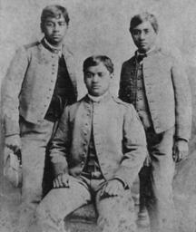 Keywords: Three Princes of Hawaii at San Mateo without caps (restored).jpg </ref> en Three Princes of the Kingdom of Hawaii attended St Matthews Hall the Episcopal military school of St Matthew's Church founded by Revered Brewer in 1865 in San Mateo California That school now thrives as St Matthew's Episcopal Day School The princes attended from 1883-1887 They are Jonah Kūhiō Kalanianaʻole left 1871 1922 David Kawānanakoa center 1868 1908 and Edward Abnel Keliʻiahonui right 1869 1887 On Sunday July 19 1885 in Santa Cruz the young Hawaiian princes were in the water at the mouth of the San Lorenzo enjoying it hugely and giving interesting exhibitions of surf-board swimming as practiced in their native islands Beach Breezes July 20 1885 The Daily Surf Santa Cruz CA As such they were the first to bring surfing to mainland America ca 1886 article Kalakaua's Hawaiian Studies Abroad Program by Agnes Quigg in Hawaii Journal of History vol 22 1988 page 176 Rieman and Pray http //www hawaiialive org/resources/manuscript/442 pdf California in the 1880s David Kawānanakoa Jonah Kūhiō Kalanianaʻole Edward Abnel Keliʻiahonui Princes of Hawaii Study abroad students Photographs in the Bernice Pauahi Bishop Museum PD-old |