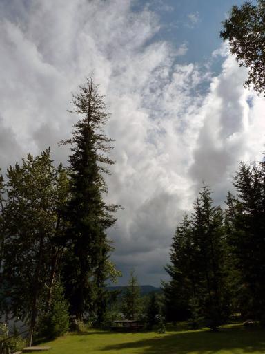Keywords: thunderstorm towering cumulus clouds windy landscape nature scenery trees canim lake british columbia canada