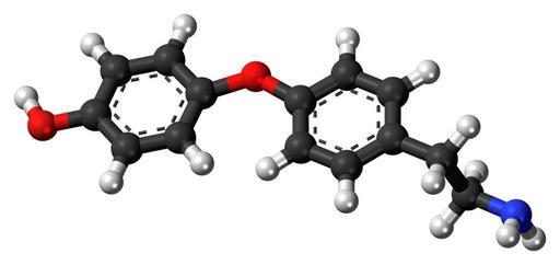 Keywords: Thyronamine 3D ball.png Ball-and-stick model of the thyronamine molecule Colour code 505050 Carbon C black<br> F0F0F0 Hydrogen H white<br> F51E1E Oxygen O red<br> 3C50FA Nitrogen N blue<br> 2011-06-25 own DS Visualizer Jynto talk Space-filling version cc-zero phenethylamines Phenoxybenzenes Hydroxyphenol ethers Images by Jynto |