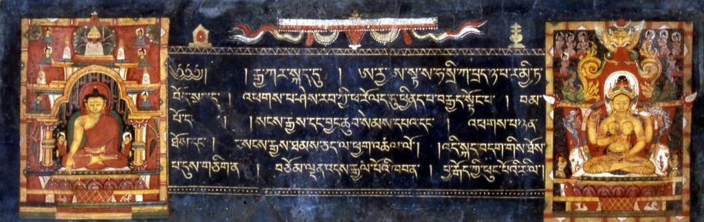 | Keywords: Tibetan - Buddha Shakyamuni and Prajnaparamita - Walters W8561.jpg This is a leaf from a Prajnaparamita Perfection of Wisdom manuscript The text written in Tibetan language and script is a translation of a Sanskrit text that was produced in India as much as a thousand years earlier The translation of hundreds and hundreds of texts into Tibetan was an immense cultural achievement On the left appears the Buddha Shakyamuni on the night of his enlightenment at Bodhgaya The tree under which he was enlightened appears above the temple The goddess at right is Prajnaparamita a personification of the text or an embodiment of its words This is the first leaf The last leaf includes a statement that this sacred object was commissioned by two children for the use of their parents following their rebirth on earth century 13 ink paint paper cm 23 81 69 22 ; Framed cm 32 39 84 77 5 72 accession number W 856 1 40884 John and Berthe Ford Baltimore date and mode of acquisition unknown Walters Art Museum John Berthe Ford 2001 Buddhist text Goddess Divine Energy Art Gallery of New South Wales Sydney 2006-2007 Embodying the Holy Icons in Eastern Orthodox Christianity and Tibetan Buddhism Rubin Museum of Art New York 2010-2011 place of origin Tibet Walters Art Museum license 2D Tibetan art in the Walters Art Museum Tibetan manuscripts Tibetan writing Buddha Prajnaparamita Tibet in the 13th century |