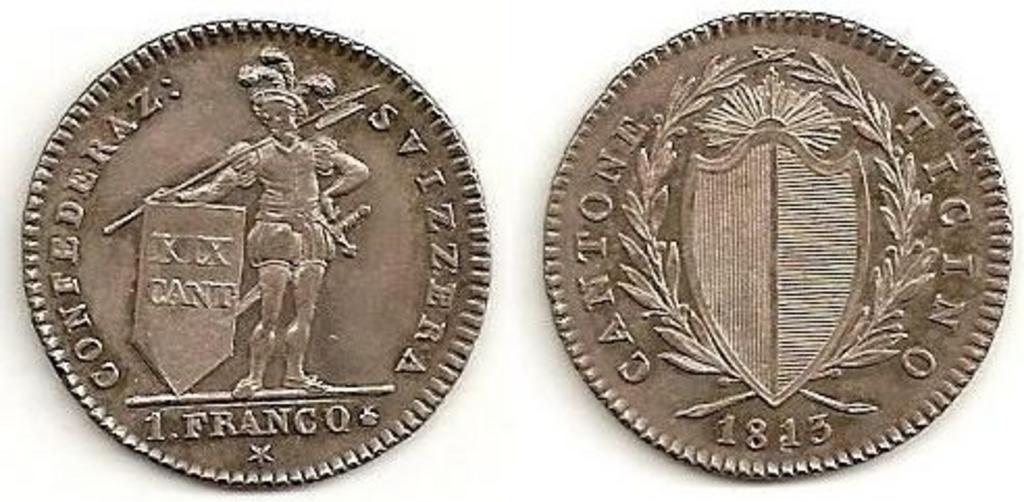 Keywords: Ticino 1Franco (1815).jpg en 1 Franc of Ticino Switzerland from 1815 Own Saippuakauppias PD-old Coins of Switzerland