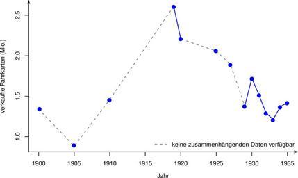Keywords: Ticketverkäufe Freiburg Hauptbahnhof 1900–1935.svg en Tickets sold at Freiburg Hauptbahnhof de Anzahl der verkauften Fahrkarten am Freiburger Hauptbahnhof inklusive der Haltepunkte Basler Straße Zähringen und Herdern own El Grafo 2010-02-28 Created with R Inkscape Data from http //www ub uni-freiburg de/index php id adressbuecher Freiburger Adressbücher save as data csv <pre> year tickets 1900 1340954 1905 881441 1910 1459104 1919 2610888 1920 2206057 1925 2057775 1927 1889864 1929 1379593 1930 1721429 1931 1514939 1932 1291310 1933 1212706 1934 1369997 1935 1421405 1960 1380842 </pre> save as data_NA csv <pre> year NA tickets NA 1900 1340954 1901 NA 1902 NA 1903 NA 1904 NA 1905 881441 1906 NA 1907 NA 1908 NA 1909 NA 1910 1459104 1911 NA 1912 NA 1913 NA 1914 NA 1915 NA 1916 NA 1917 NA 1918 NA 1919 NA 1919 2610888 1920 2206057 1921 NA 1922 NA 1923 NA 1924 NA 1925 2057775 1926 NA 1927 1889864 1928 NA 1929 1379593 1930 1721429 1931 1514939 1932 1291310 1933 1212706 1934 1369997 1935 1421405 1936 NA 1937 NA 1938 NA 1939 NA 1940 NA 1941 NA 1942 NA 1943 NA 1944 NA 1945 NA 1946 NA 1947 NA 1948 NA 1949 NA 1950 NA 1951 NA 1952 NA 1953 NA 1954 NA 1955 NA 1956 NA 1957 NA 1958 NA 1959 NA 1960 1380842 </pre> R-code <pre> read data read the original time-series this one is needed for the dashed grey line connecting all the dots data <- read csv data csv sep data <- data-15 remove data after 1935 data 2 <- data 2/1000000 devide data by 1000000 to get millions on the y-Axis attach data read the time-series filled up with NA's this one is needed for the solid lines which are connecting only dots of cohering years data NA <- read csv data_NA csv sep data NA <- data NA- 38 nrow data NA remove data after 1935 attach data NA tickets NA <- tickets NA/1000000 devide data by 1000000 to get millions on the y-Axis plotting un-comment for pdf-output pdf file test3 pdf width 10 height 7 par cex 1 2 first plot the grey line plot tickets ~ year type l lty 2 col grey50 xlab Jahr ylab verkaufte Fahrkarten Mio bty l lwd 2 add the dots points tickets NA ~ year NA pch 16 col blue add the blue lines lines tickets NA ~ year NA type l lwd 2 col blue lend 3 add the legend legend x bottomright legend keine zusammenhängenden Daten verfügbar lty 2 col grey50 lwd 2 bty n un-comment for pdf-output dev off </pre> The Graph was exported as PDF and imported in Inkscape for slight adjustments e g Arrows and then exported as SVG History of Freiburg Hauptbahnhof Files by User El Grafo