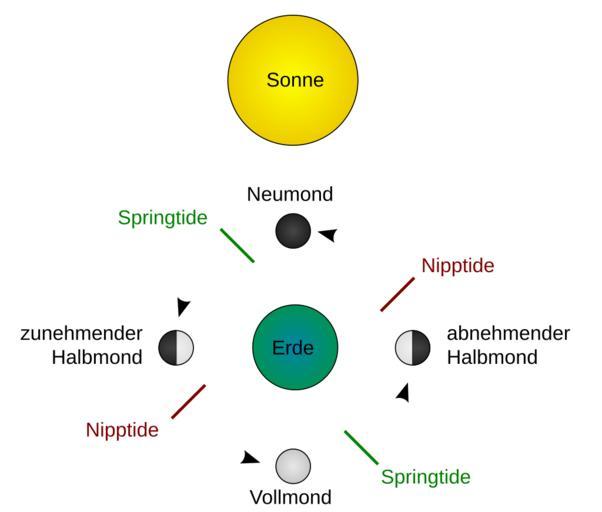 Keywords: Tide schematic de.svg de Schematische Darstellung der Tiden en Tides schematic Due to the bathymetry of some areas neap and spring tides reach their maximum force 2 days after the first quarter moon third quarter moon and new moon full moon respectively In the absence of complications due to bathymetry spring tides are exactly at the full and new moons and neap tides are exactly at the one-quarter and three-quarter moon Every six hours the water also lowers or heightens; as such four tides are created <br>Low water spring tide<br/> High water spring tide<br/> Low water neap tide<br/> High water neap tide<br/> Tide schematic svg 50 2013-08-09 23 02 UTC Tide schematic svg KVDP SVG conversion by Surachit derivative work Furfur Other fields A 45 + Diagrams German translation minor edits Furfur Tide schematic svg Tides |