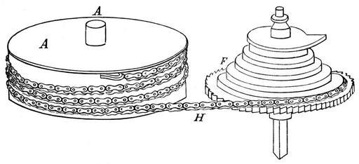 | Keywords: Tidens naturlære fig29.png  Tidens naturlære 1903 af Poul la Cour Fig 29 Uhrfjeder og Snegl <br> Bogen findes digitalt på s da Tidens Naturlære<br><br> Drawing of a fusee from Tidens naturlære Nature of time 1903 by Poul la Cour Ill 29 The book is digitized at s da Tidens Naturlære The fusee F was a conical pulley that was used in antique clocks and watches to equalize the declining pull of the mainspring as the watch ran improving timekeeping The fusee chain H wrapped around the mainspring barrel A that contained the mainspring and the fusee The pull of the spiral mainspring turned the barrel which pulled the chain which turned the fusee The ring of gear teeth around the fusee turned the wheels of the watch Just after the watch is wound up the fusee chain comes off the top narrow part of the fusee pulley so the strong pull of the wound up spring was scaled down by the narrow lever arm As the watch ran and the mainspring unwound so its torque was less the force was applied to the wider lower part of the fusee as shown increasing the lever arm and scaling up the torque so it remained constant over the running period of the spring The constant force applied to the watch's escapement improved timekeeping accuracy Fusees became obsolete in the 19th century with the wide use of the going barrel which provided a constant force From the book Tidens naturlære 1903 by Poul la Cour 2006-08-07 Morten Bisgaard PD-Old PD-old Tidens naturlære Fusee horology Old horology prints |