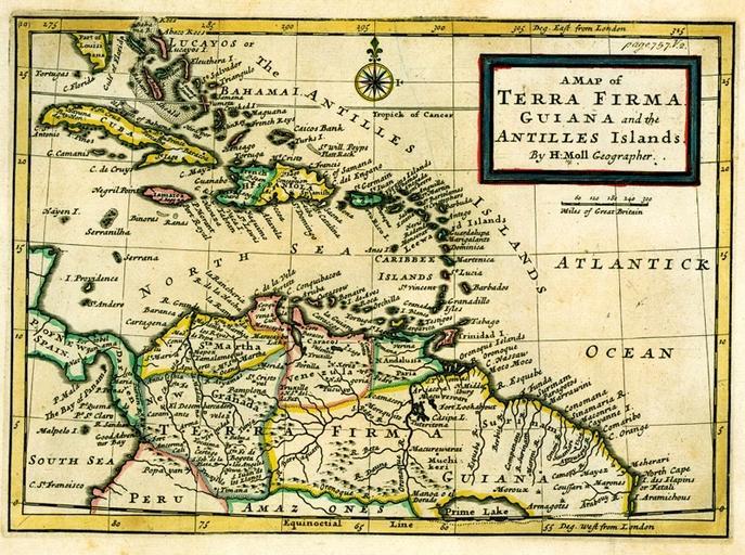 | Keywords: TierraFirme.jpg A map of Terra Firma Guiana and the Antilles Islands Mapa de la Tierra Firme Guayana y las Islas Antillas Mapa de 1732 http //www igvsb gov ve/site2007/index php option com_content task view id 90 Itemid 136 Instituto Geográfico de Venezuela Simón Bolívar H Moll 1732 PD-old-100 1732 maps Old maps of the Caribbean Old maps of South America 1732 in South America |