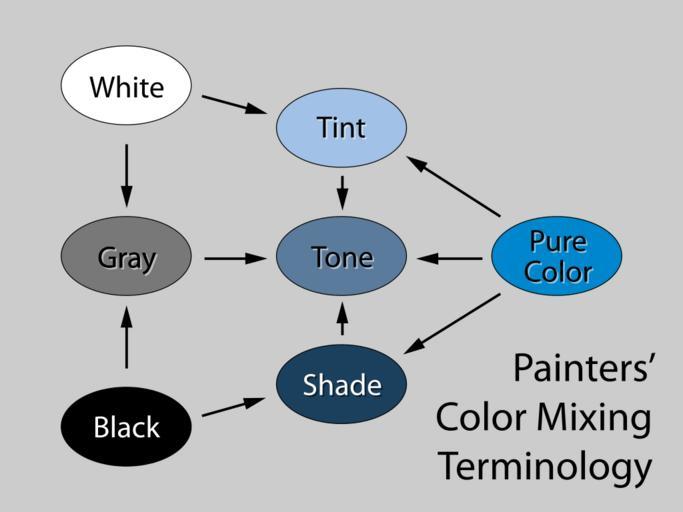 Keywords: Tint-tone-shade.svg en A diagram demonstrating common color mixing terms A tint is any mixture of a a bright pure color with white A shade is any mixture of a pure color with black A tone is any mixture of all three white black and the pure color own Jacobolus Check categories 2010 January 26 en wikipedia Tints_and_shades Colors Optics 2 Painting SVG colors |