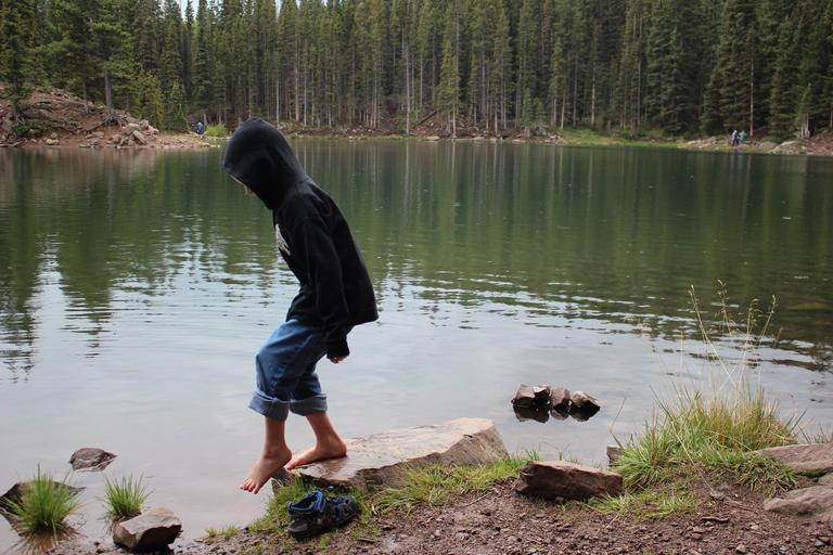Keywords: tip-toe boy lake barefoot mountains evergreen outdoors hoodie