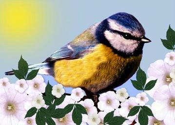 Keywords: tit bird nature painting flowers wildlife animal songbird outdoors tree perched ornithology spring wing avian feather life beak habitat environment yellow-rumped birdwatching migration fly singing conservation breast cute