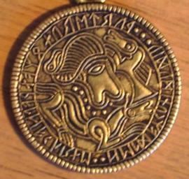 Keywords: Tjurko bracteate replica.jpg brass replica of the Tjurkö 1 bracteate DR BR75 Statens Historiska Museum 1453 heldaz kunimudiu wurte runoz an walhakurne Helda for Kunimundi wrought the runes on the Roman coin the original bracteate is of gold with a diameter of 27 mm the facsimile was obviously made after http //skaldic arts usyd edu au/db php table images id 21005 this drawing exaggerating the gap before the o of runoz and showing a short-twig Younger Futhark a in an judging from the image linked above both without basis in the original http //www canadianmysteries ca/sites/vinland/images/site/163809_2 jpg herehttp //skaldic arts usyd edu au/db-jpeg php is another image of the original own 2006-05-02 User Dbachmann Archaeological record of Odin Archaeological finds from Blekinge Statens historiska museum Replicas of archaeological objects Migration Period bracteates in Sweden Elder Futhark inscriptions |