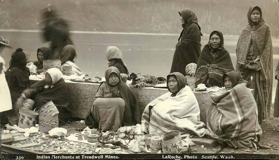 Keywords: Tlingit Indian women selling baskets, Treadwell gold mines, Douglas Island, Alaska, ca 1894 (LAROCHE 243).jpeg check categories 9 June 2016 3 Photograph Creator Frank La Roche Caption on image Indian merchants at Treadwell Mines After the Treadwell Mines opened in 1881 women came from nearby villages to sell baskets beaded clothing and other wares to the gold miners and tourists The baskets for sale in this photograph are Tlingit in style The Treadwell Mines were located on Douglas Island across the channel from Juneau After photographing many parts of the United States Frank La Roche arrived in Seattle in 1889 He was active in Seattle and beginning in 1898 made around 100 trips to Alaska and the Yukon La Roche retired in 1912 and died in Sedro-Wooley Washington in the 1930s Seattle Post-Intelligencer Oct 4 1906; Carl Mautz Biographies of Western Photographers p 500 Subjects LCTGM Baskets; Women--Alaska--Douglas Island; Clothing dress--Alaska--Douglas Island Subjects LCSH Treadwell Mines; Tlingit Indians--Alaska--Douglas Island--Commerce; Tlingit Indians--Alaska--Douglas Island--Women; Tlingit Indians--Alaska--Douglas Island--Clothing dress; Tlingit Indians--Alaska--Douglas Island--Arts crafts depicted place United States--Alaska--Treadwell ca 1894 Institution University of Washington UWASH-LAROCHE-source accession number laroche 243 PD-old-auto-1923 1936 Information field Order Number LAR136 Images from the Frank La Roche Photographs Collection to check Baskets Women Treadwell Mines |