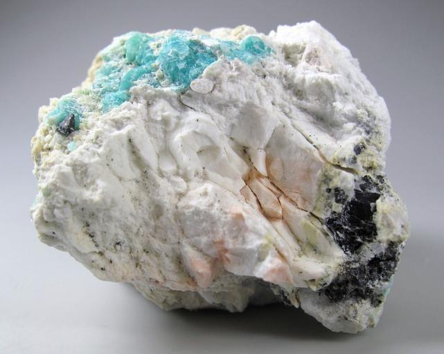 Keywords: Tn MW misc 002.jpg en White powdery gearksutite with blue-green amazonite lavender prosopite and black tantalite- Mn Pinkish color is due to Mn inclusions in altered prosopite From the weather aluminum-fluoride zone 32' level NE Collector Oct 2004 owner MWylie own User Mark Joseph Wylie image 1/31/2009 Morefield Pegmatite Mine Amelia Co Virginia USA Cc-zero Gearksutite |