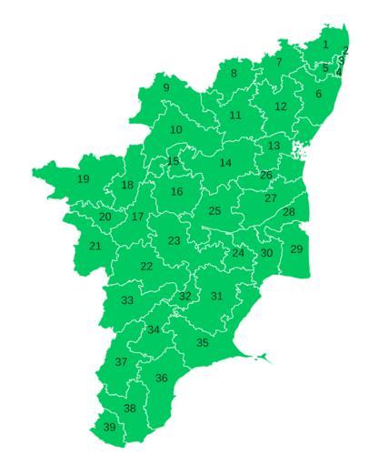 Keywords: TN Parliamentary constituencies 2.svg en A map showing the Parliamentary constituencies of the Indian State of Tamil Nadu 2015-11-11 own Nirinsanity other versions cc-zero Election maps of Tamil Nadu Uploaded with UploadWizard