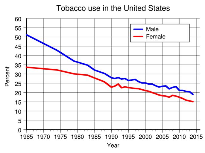 Keywords: Tobacco use in the United States.svg translate yes en Tobacco use in the United States from 1965 to 2014 Data source http //www cdc gov/nchs/hus/contents2015 htm CDC Table 47 2016-05-16 own Delphi234 other versions current annually Generated with Wikimedia SVG Chart SVG Chart/box cc-zero Tobacco-related graphics Health in the United States |