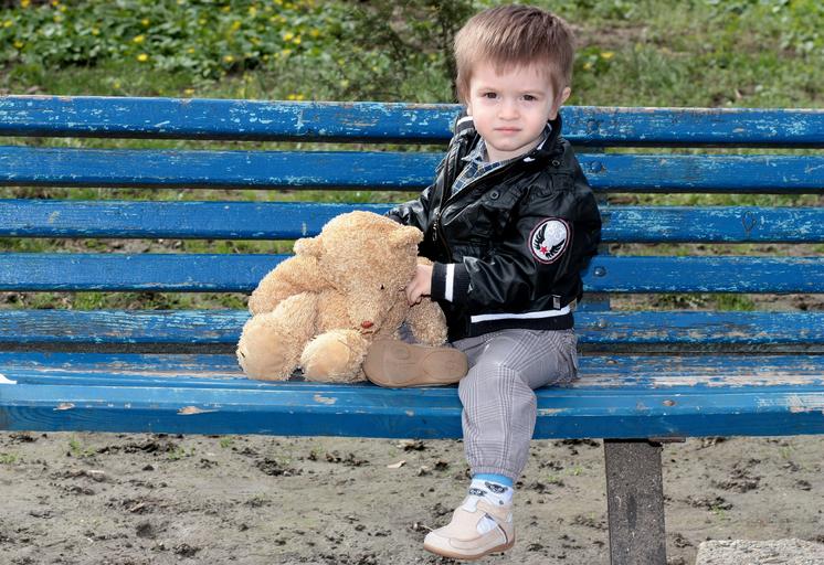 Keywords: toddler boy teddy bear bank play park innocence