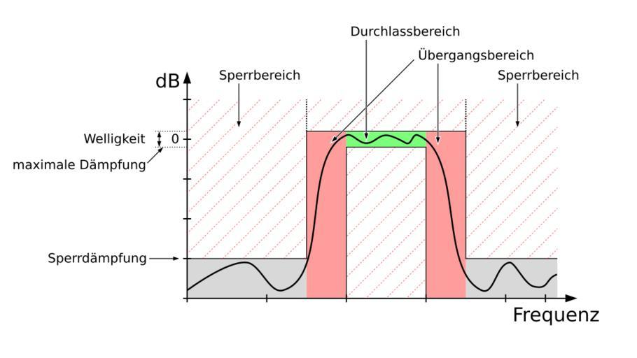 Keywords: Toleranzschema Filter.svg de Tolerenzschema für Filter mit Durchlassbereich à bergangsbereich und Sperrbereich sowie Sperrdämpfung Welligkeit und maximale Dämpfung im Durchlassbereich Own Biezl Inkscape Filter diagrams