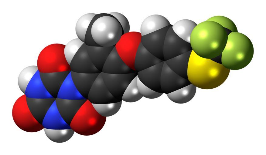 Keywords: Toltrazuril molecule spacefill.png Space-filling model of the toltrazuril molecule a coccidiostat Color code 505050 Carbon C black<br> F0F0F0 Hydrogen H white<br> F51E1E Oxygen O red<br> 3C50FA Nitrogen N blue<br> C8FA64 Fluorine F yellow-green<br> FAEB00 Sulfur S yellow<br> 2011-08-02 own DS Visualizer Jynto talk Ball-and-stick version cc-zero Images by Jynto Antiparasitic agents Triazines Phenoxybenzenes Thiophenol ethers Trifluoromethyl compounds |