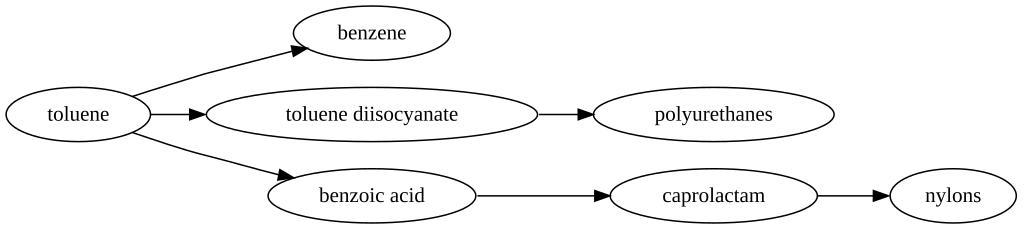 | Keywords: Toluene chemical production network.svg Petrochemical Produced using Graphviz Source code is below <pre>digraph G rankdir LR toluene -> benzene toluene -> toluene diisocyanate toluene diisocyanate -> polyurethanes toluene -> benzoic acid benzoic acid -> caprolactam caprolactam -> nylons </pre> own Mr3641 2010-10-25 Chemical processes Toluene |