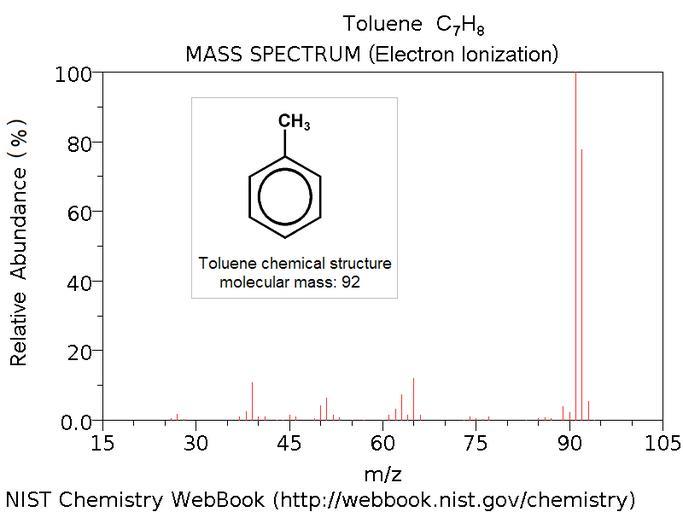 | Keywords: Toluene ei ms.PNG en Electron Ionization EI Mass Spectrum MS of Toluene C<sub>7</sub>H<sub>8</sub> <br> Note the parent peak at m/z 92 representing the molecular mass of toluene divided by a charge of +1 This image is based on File Toluene ei ms gif originally from http //webbook nist gov/cgi/cbook cgi Name toluene uploaded into WikiCommons by User Kkmurray on April 22 2007 and slightly edited and converted from gif to PNG format by H Padleckas <span class signature-talk >talk</span> on March 24 2009 Originally US Government-NIST uploaded into WikiCommons by User Kkmurray and slightly edited and converted from gif to PNG format by H Padleckas <span class signature-talk >talk</span> First uploaded into WikiCommons on April 22 2007 and slightly edited and converted from gif to PNG format on March 24 2009 File Toluene ei ms gif PD-USGov Mass spectra Toluene |