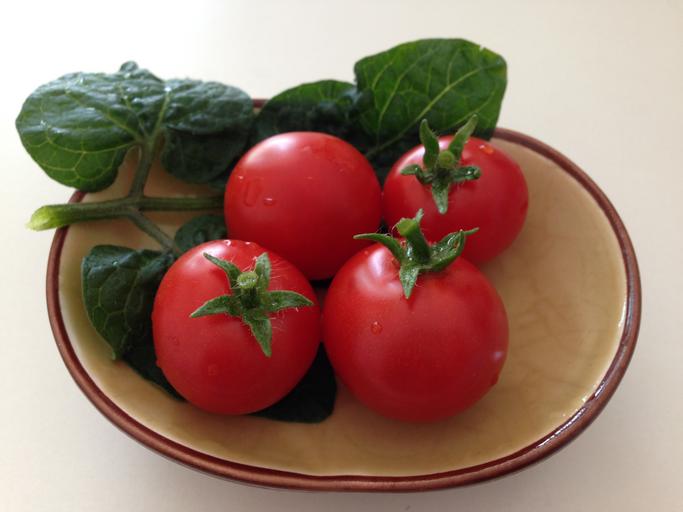 Keywords: tomato small tomato vegetable red saucer green leaf