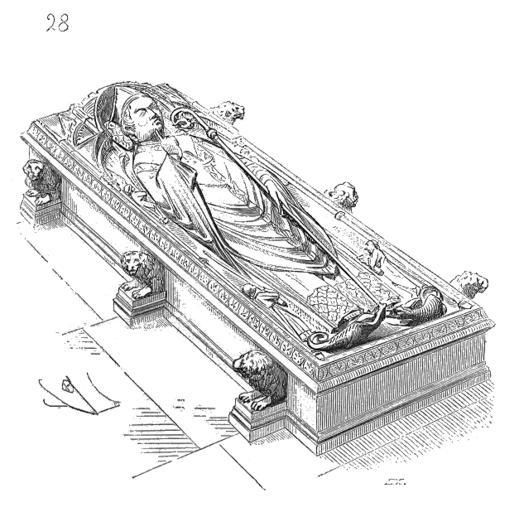 | Keywords: Tombeau.cathedrale.Amiens.png Drawings by Eugène Viollet-le-Duc Nous ne possédons plus en France que quatre tombes de métal dans le genre de celle de Charles le Chauve Deux sont sans émaux ce sont les tombes des évêques d'Amiens Ewrard de Fouilloy et Godefroy; l'un de ces deux monuments est d'une grande valeur comme art c'est celui de l'évêque Ewrard La tête les draperies admirablement modelées sont d'un style excellent Nous donnons fig 28 une copie de ce tombeau Le personnage demi ronde bosse est fondu avec la plaque et la table repose sur un socle de pierre très-bas avec six lions issants L'évêque bénit et porte la crosse Deux anges thuriféraires en bas-relief encensent sa tête qui repose sur un coussin richement décoré Deux clercs également en bas-relief tiennent des flambeaux Les pieds du prélat reposent sur deux dragons Une inscription et un bel ornement courant enveloppent la igure encadrée par une sorte de dais à sa partie supérieure L'évêque Ewrard de Fouilloy fut le fondateur de la cathédrale actuelle d'Amiens commencée en 1220 Il mourut en 1223; donc son tombeau placé autrefois à l'entrée de la nef dans l'axe date de la première moitié du XIII<sup>e</sup> siècle; il possède d'ailleurs tous les caractères de cette époque Dictionnaire raisonné de l'architecture française du XI<sup>e</sup> au XI<sup>e</sup> siècle ~ 1856 Eugène Viollet le Duc Viollet-le-Duc |