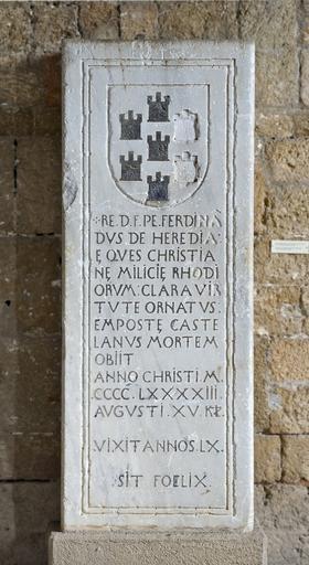 | Keywords: Tombstone knight Rhodes.jpg en Tombstone of Aragonese Knight Hospitaller Pedro Fernandez de Heredia 1493 aug 15th age 60 fr Pierre tombale du Chevalier Hospitalier aragonais Pedro Fernandez de Heredia mort le 15 août 1493 âgé de 60 ans Institution Archaeological Museum of Rhodes own Jebulon 2011-04-14 36 26 41 9 N 28 13 35 9 E Gravestones in Greece Sovereign Military Order of Malta buildings in Rhodes 1493 deaths Medieval sculptures in the Archaeological Museum of Rhodes Towers in heraldry Quality images by Jebulon Johan Ferrández d'Heredia GM 32 Cc-zero QualityImage |