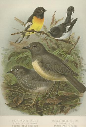 Keywords: Tomtit & Robins.jpg North-Island Tomtit Myiomoira toitoi South-Island Tomtit Myiomoira macrocephala North-Island Robin Miro australis South-Island Robin Miro albifrons en Top left - South Island Tomtit Petroica macrocephala macrocephala Top right - North Island Tomtit Petroica macrocephala toitoi Bottom left - North Island Robin Petroica australis longipes Bottom right - South Island Robin Petroica australis australis Buller's A History of the Birds of New Zealand 2nd edition Published 1888 Published 1888 By J G Keulemans PD-old-auto-1923 1912 checked WikiProject Birds A History of the Birds of New Zealand by Buller Plate V Petroica macrocephala Petroica australis |