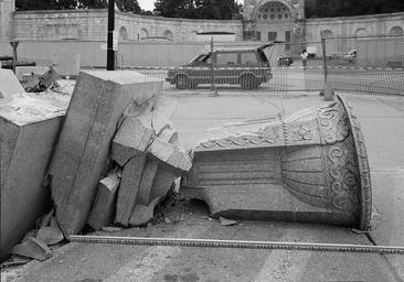 Keywords: Toppled gate pylon and Hemicycle - Arlington County VA - 1996-07-11.jpg en Toppled gate pylon at Arlington National Cemetery in Arlington County Virginia in the United States The pylon erected in 1932 was accidentally toppled during construction of the Women in Military Service for America Memorial http //www loc gov/pictures/item/va2061 photos 362319p/ Jack E Boucher Historic American Buildings Survey Library of Congress 1996-07-11 Women in Military Service for America Memorial Arlington National Cemetery Main Gates PD-USGov |