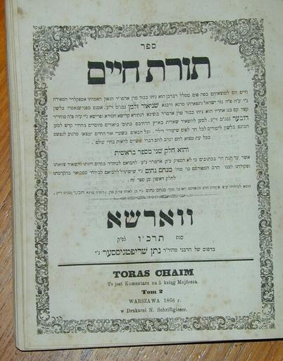 Keywords: Torath2.jpg Title page of Toras Chaim by Rabbi DovBer of Lubavitch the Mitteler Rebbe published by Nosson Shriftnisser Press Warsaw 1866 Photographed by User Sf2000 1866 Nosson Shriftnisser Press PD-old-100 Chabad texts Religious books book covers single pages etc Title pages of Hebrew books |