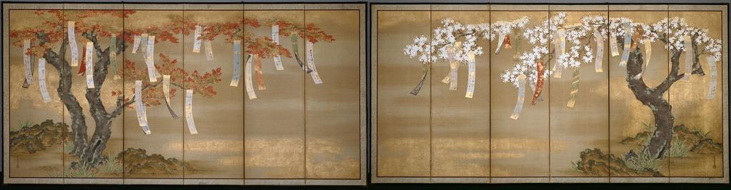 Keywords: Tosa Mitsuoki - Flowering Cherry and Autumn Maples with Poem Slips - Google Art Project.jpg <p><em>Beyond Golden Clouds Japanese Screens from the Art Institute of Chicago and the Saint Louis Art Museum</em> Saint Louis venue October 18 2009- January 3 2010</p><p><em>Beyond Golden Clouds Japanese Screens from the Art Institute of Chicago and the Saint Louis Art Museum</em> Regenstein Hall June 26-September 27 2009 </p> Pair of six-panel screens; ink color gold and silver on silk special url_id JAHkioiHThL7TA PD-old-100-1923 1691 Tosa Mitsuoki Google Art Project works by Tosa Mitsuoki |