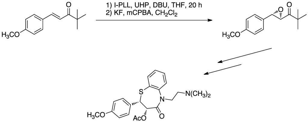 | Keywords: Total Synthesis of Diltiazem6.png en The Juliá-Colonna Epoxidation has been applied to the Total Synthesis of Diltiazem „¢ From Adger B M ; Barkley J V ; Bergeron S ; Cappi M W ; Flowerdew B E ; Jackson M P ; McCague R ; Nugent T C ; Roberts S M Improved procedure for Julia-Colonna asymmetric epoxidation of α β-unsaturated ketones total synthesis of diltiazem and Taxol TM side-chain J Chem Soc -Perkin Trans 1 1997 23 3501-3507 own C rose kennedy Total syntheses Drug syntheses Diltiazem Juliá-Colonna epoxidation |