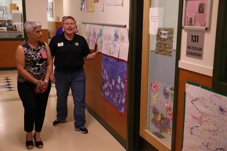 MAKE A MEME View Large Image Tour of children's center 150701-N-DC740-011.jpg en 150701-N-DC740-011 OAK HARBOR Wash July 1 2015 Genia Wessels director of Naval Air Station Whidbey Island's Regatta Child Development Center right gives Martha Faller Chief of Naval ...