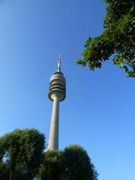 Keywords: tower olympic park munich tree green blue sky branches leaves high olympia tower sunny summer