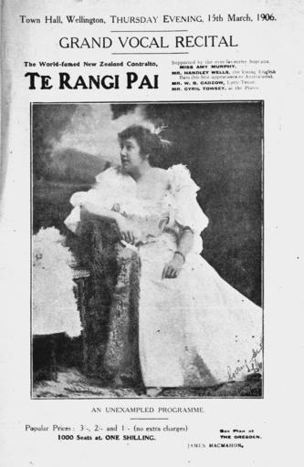 | Keywords: blackandwhite monochrome text photo border black and white Shows a full-length portrait of Princess Te Rangi Pai (Fanny Rose Howie, nee Porter) seated in a photographic studio setting. Quantity: 1 colour photo-mechanical print(s) on cover of programme.. Physical Description: Photolithograph, on cover 220 x 143 mm. Town Hall, Wellington :Grand vocal recital, Thursday evening, 15th March, 1906. The world-famed New Zealand contralto Te Rangi Pai, supported by the ever-famous soprano Miss Amy Murphy, Mr Handley Wells the young English bass, Mr W B Cadzow lyric tenor, [and] Mr Cyril Towsey at the piano. [Programme cover] 1906.. Ref: Eph-A-MUSIC-1906-01-cover. Alexander Turnbull Library, Wellington, New Zealand. natlib.govt.nz/records/23081934 Shows a full-length portrait of Princess Te Rangi Pai (Fanny Rose Howie, nee Porter) seated in a photographic studio setting. Quantity: 1 colour photo-mechanical print(s) on cover of programme.. Physical Description: Photolithograph, on cover 220 x 143 mm. Town Hall, Wellington :Grand vocal recital, Thursday evening, 15th March, 1906. The world-famed New Zealand contralto Te Rangi Pai, supported by the ever-famous soprano Miss Amy Murphy, Mr Handley Wells the young English bass, Mr W B Cadzow lyric tenor, [and] Mr Cyril Towsey at the piano. [Programme cover] 1906.. Ref: Eph-A-MUSIC-1906-01-cover. Alexander Turnbull Library, Wellington, New Zealand. natlib.govt.nz/records/23081934 |