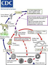 | Keywords: Toxocara canis LifeCycle(French version).GIF Toxocara caniNematoda Toxocaridae Toxocara_canis_LifeCycle French_version GIF Traduction en français de l ™image suivante Toxocara_canis_LifeCycle GIF Toxocara canis accomplishes its life cycle in dogs with humans acquiring the infection as accidental hosts Following ingestion by dogs the infective eggs yield larvae that penetrate the gut wall and migrate into various tissues where they encyst if the dog is older than 5 weeks In younger dogs the larvae migrate through the lungs bronchial tree and esophagus; adult worms develop and oviposit in the small intestine In the older dogs the encysted stages are reactivated during pregnancy and infect by the transplacental and transmammary routes the puppies in whose small intestine adult worms become established Thus infective eggs are excreted by lactating bitches and puppies Humans are paratenic hosts who become infected by ingesting infective eggs in contaminated soil After ingestion the eggs yield larvae that penetrate the intestinal wall and are carried by the circulation to a wide variety of tissues liver heart lungs brain muscle eyes While the larvae do not undergo any further development in these sites they can cause severe local reactions that are the basis of toxocariasis http //www dpd cdc gov/DPDx/HTML/ImageLibrary/Toxocariasis/ Toxocara_canis_LifeCycle GIF centre for disease control gov PD-USGov Toxocara c life cycle PD-USGov CDC lifecycles |