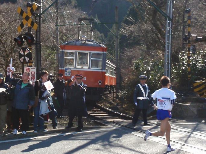 | Keywords: Tozan Kowakidani cross Ekiden Nittaidai.jpg en When the runner of Hakone-ekiden Relay Race passes Hakone Tozan Railway stops the train in this side of the railroad crossing 35 24009 139 05402 2010 Hakone Ekiden Hakone Tozan Type Moha 1 Kowakidani crossing |