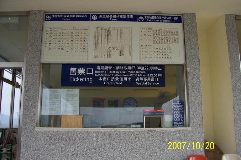 | Keywords: TRA Dongli Station 04.jpg Taiwan Railway Administration Dongli Station 新 里站售票口 zh wikipedia Quatro Valvole CommonsHelper 2007-10-30 蔡詠任 wikipedia zh Watermark 蔡詠任 Original upload log page zh wikipedia 100_2869 JPG 2007-10-30 13 29 蔡詠任 2576×1716× 1064614 bytes TRA Dongli Station |
