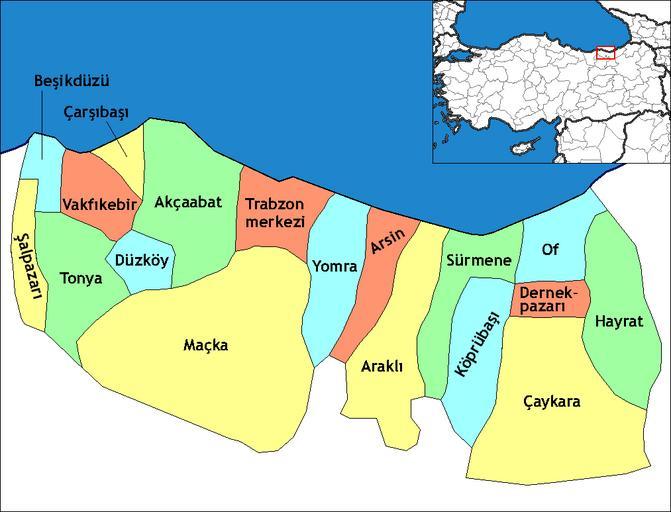 | Keywords: Trabzon districts.png Map of the districts of Trabzon province in Turkey Created by Rarelibra 17 52 4 December 2006 UTC for public domain use using MapInfo Professional v8 5 and various mapping resources Edited by One Homo Sapiens Corrected text where İ Ş ı ğ or ş occurs in name Source statoids-com Increased font size and enhanced color differences among adjacent districts 2006-12-04 own assumed Rarelibra Maps of Trabzon Province Maps of districts in Turkey Districts of Trabzon Province |