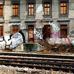 Keywords: track window door old railway station platform graffiti home building wood wall stone shabby input housewife