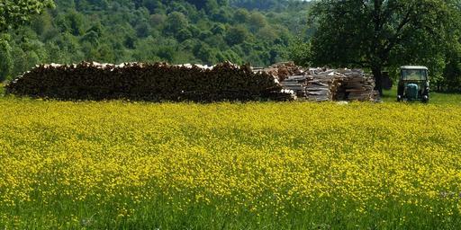 Keywords: tractor tractors landscape nature summer holzstapel wood flower meadow yellow spring mood