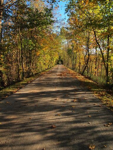 Keywords: trail road path trees autumn fall color asphalt landscape lines perspective