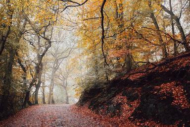 Keywords: trail woods forest trees path foliage nature autumn fall park recreation environment footpath scenic hiking leaves uphill