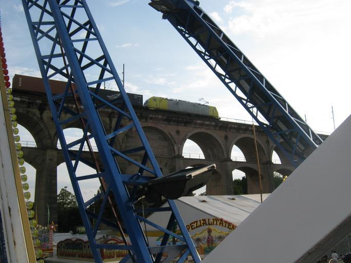 Keywords: Train on Bietigheim Viaduct seen from Ferris wheel1.JPG en A train on Bietigheim viaduct photographed from Ferris wheel on Bietigheim Horsemarket 2010 own Zonk43 2010-09-03 Pferdemarkt Bietigheim 2010