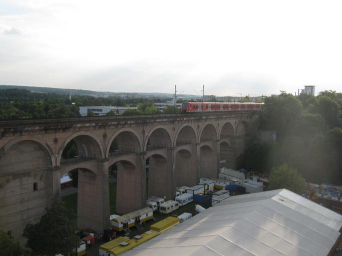 Keywords: Train on Bietigheim Viaduct seen from Ferris wheel3.JPG en A train on Bietigheim viaduct at Bietigheim Horsemarket 2010 own Zonk43 2010-09-03 Pferdemarkt Bietigheim 2010