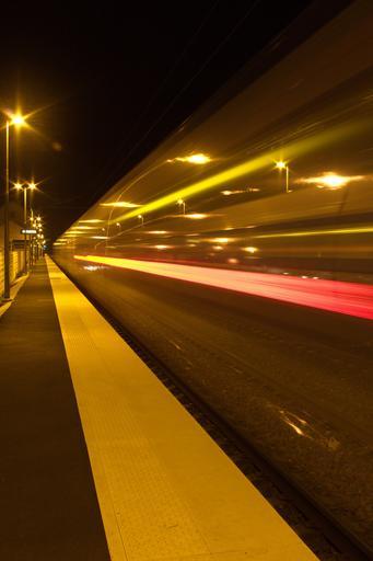 Keywords: train ter wharf speed station night lighting reflection transparency track ferré path iron line leak