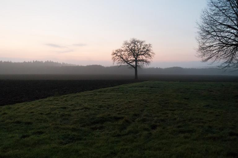 Keywords: tree arable abendstimmung landscape field nature sky mood fog agriculture plowed november coloring orange red blue