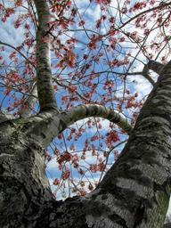 Keywords: tree branches leaves sky curves stripes bark nature pink blue gray black plant flora