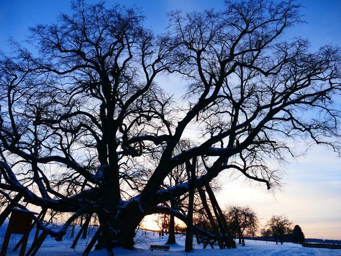 Keywords: tree linde old natural monument large winter landscape snow nature wintry